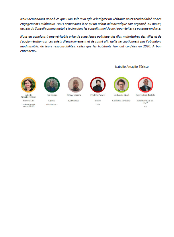 Nous demandons donc à ce que Plan soit revu afin d’intégrer un véritable volet territorialisé et des engagements minimaux. Nous demandons à ce qu’un débat démocratique soit organisé, au moins, au sein du Conseil communautaire (voire dans les conseils municipaux) pour éviter ce passage en force.