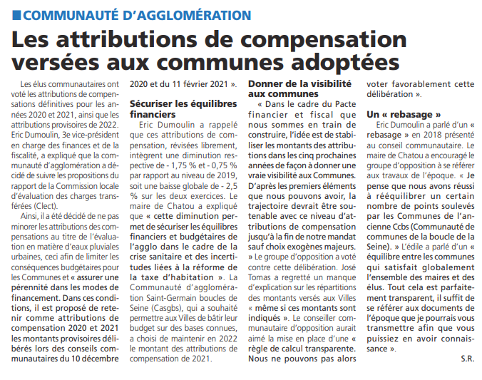 - le recours à la concession pour le service de l’assainissement du Syndicat d’assainissement de la Boucle de Seine (SABS) : c’est non pour nous à l’heure où les entreprises privées ayant des concessions/délégations sont défaillantes, il est primordial que la puissance publique (re)prenne le maximum d’emprise sur ce qui constitue un des premiers piliers de l’autonomie de nos territoires